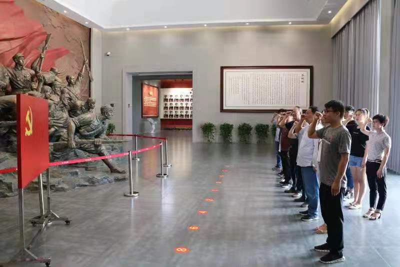 在講解員的帶領(lǐng)下,全體黨員一起參觀了郯城革命斗爭史紀(jì)念館。厚重的文化底蘊(yùn)培育了郯城人不屈不撓、發(fā)奮圖強(qiáng)的優(yōu)良品質(zhì)。1929年10月,劉之言、劉諧和、孫鎮(zhèn)國三位在馬頭三小成立了中共馬頭三小支部。1933年,劉之言率領(lǐng)發(fā)起了震驚華東的“蒼山暴動(dòng)”,暴動(dòng)雖然失敗,但革命的火種迅速燃遍了魯南大地,激發(fā)了無數(shù)青年投身革命的熱潮。抗日戰(zhàn)爭時(shí)期,面對慘無人道的日軍暴行,郯城人絕地亮劍,不畏強(qiáng)敵,敵進(jìn)我進(jìn),橫掃殘軍。解放戰(zhàn)爭時(shí)期,郯城人全力支前,無私奉獻(xiàn),寫下了一首首彪炳千秋的英雄贊歌。一張張照片,一幅幅畫面,一件件物品,一段段感人的故事把大家?guī)У侥莻€(gè)炮火紛飛的年代,全體黨員從內(nèi)心深處受到震撼和洗禮,思想得到提升。最后全體黨員在鮮紅的黨旗前,重溫入黨誓詞。