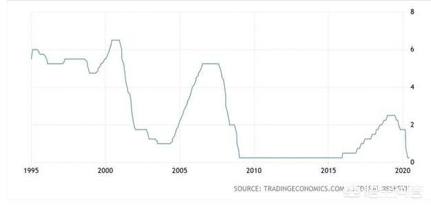 下面這張圖就是美國的基準利率走勢圖,在2000年以前,美國的利率基本都在5%以上,后來出了個互聯(lián)網(wǎng)泡沫,對經(jīng)濟影響比較大,為了拉動經(jīng)濟發(fā)展,美聯(lián)儲開始快速的將利率降低到了1%附近,一直持續(xù)到2005年。
