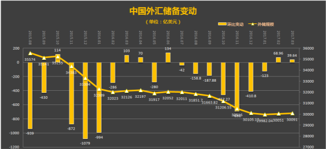 但是這一年也是從高點回落的轉(zhuǎn)折點,到年底的時候,我們的外匯儲備足足減少了5000億美元,隨后的2016年又減少了3000億美元,最終在2017年1月最低的時候降到了不到3萬億美元,隨后便開始逐步企穩(wěn)反彈,將下降趨勢最終遏制住了,至今始終維持在3萬億美元以上。