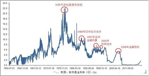 美聯(lián)儲近十年來的首次加息,其實既不是因為其國內(nèi)經(jīng)濟轉(zhuǎn)熱,也不是因為通脹抬頭,這是一個向全世界發(fā)出的行動信號,美國的每一次的緊縮周期,必然要讓在此之前釋放出去的美元,帶著財富回流,所以美聯(lián)儲一旦加息,就是吹響了美元回家的號角。我在網(wǎng)上找到一張圖,正是對美國利用金融周期收割別國財富的最好注釋,大多數(shù)時候的危機都是在美聯(lián)儲發(fā)動的緊縮周期時發(fā)生的。